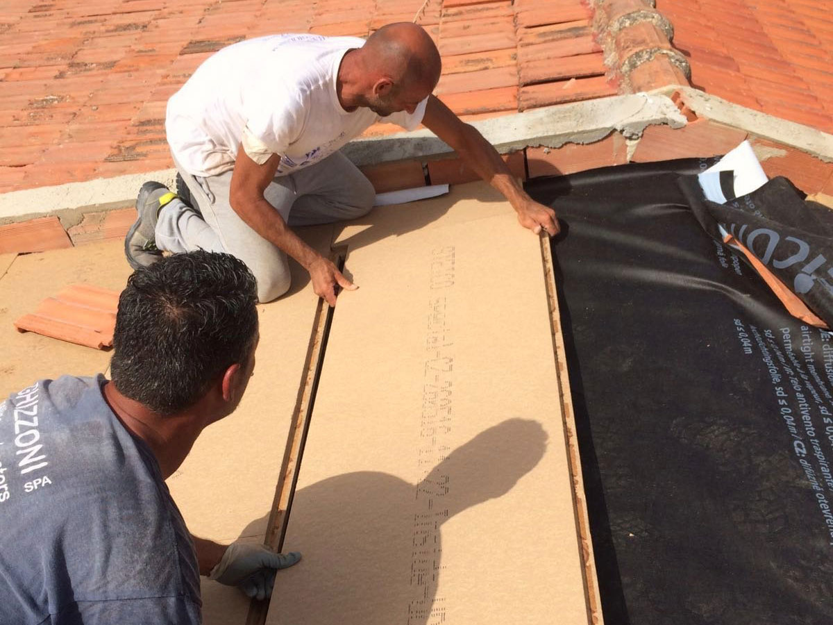 Una volta rimosso il vecchio manto di copertura, le intercapedini delle travi vengono isolate con un materiale isolante flessibile come FiberTherm® flex50 o FiberTherm® flex60. Per massimizzare l'effetto isolante, in seguito viene posato anche un pannello rigido di risanamento FiberTherm® universal direttamente sulle travi. Il pannello è idrofobizzato (idrorepellente), in modo che con un semplice intervento è possibile ottenere una tripla funzionalità: secondo strato non idrofilo, tenuta al vento ed effetto isolante.